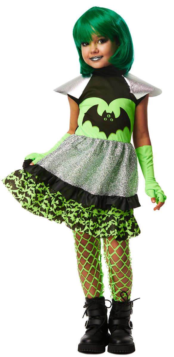 Saia em Camadas: A saia é composta por duas camadas, uma verde com pequenas estampas de morceguinhos, e outra prata com babado preto na barra, criando um visual único e encantador.