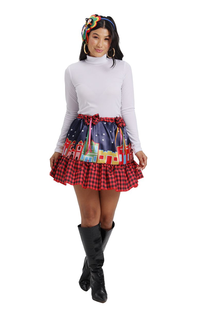 Saia curta em godê na cor azul possui estampas de casas do sertão com estrelas no céu. A saia sertão contém elasticos na região da cintura com dois lindos laços com fitilhos. E para completar o look junino a barra da sai é em babado xadrez vermelho, tornando essa a peça perfeito para o seu arraial.Confira!!!