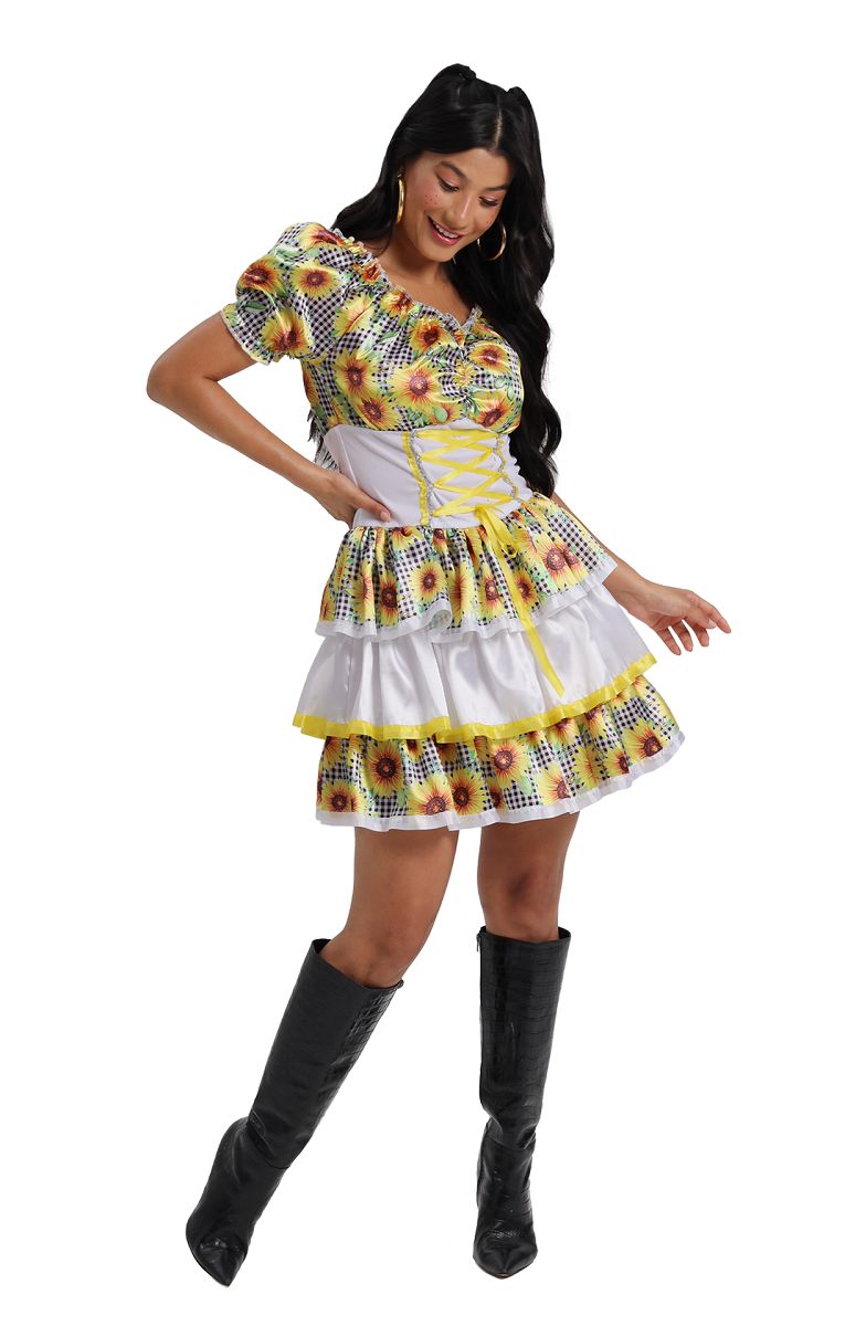 Vestido modelo ciganinha possui uma linda estampa de girasol, suas mangas são bufantes com elasticos. Descendo para a saia, ela contém camadas e babados na mesma estampa de girasol, além disso tudo, o vestido tem um ajustador na parte da cintura com fita de cetim na cor amarelo. Tornando esse o vestido junino perfeito para a sua festa.