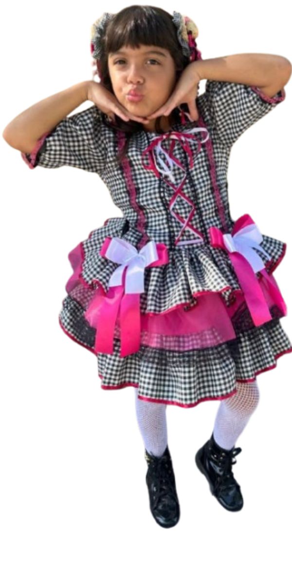 Prepare a sua pequena para brilhar no arraiá de 2025 com este elegante Vestido Junino Infantil Caipira Xadrez Preto com Rosa Luxo!